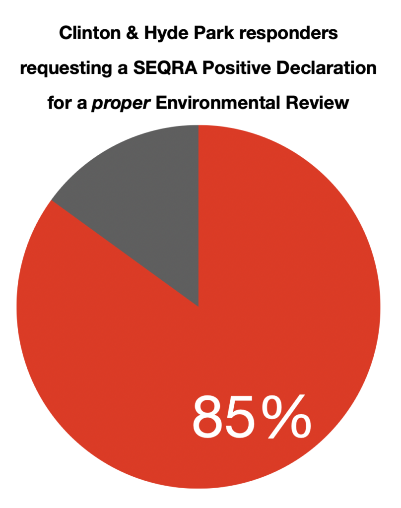 The record shows 85% of Clinton & Hyde Park respondents (155 of 183) requested a POSITIVE DECLARATION. These are the residents from the two municipalities where the project is located, that the Clinton Planning Board is responsible to as “Lead Agency“, and who live in the towns impacted by the project’s environmental concerns.